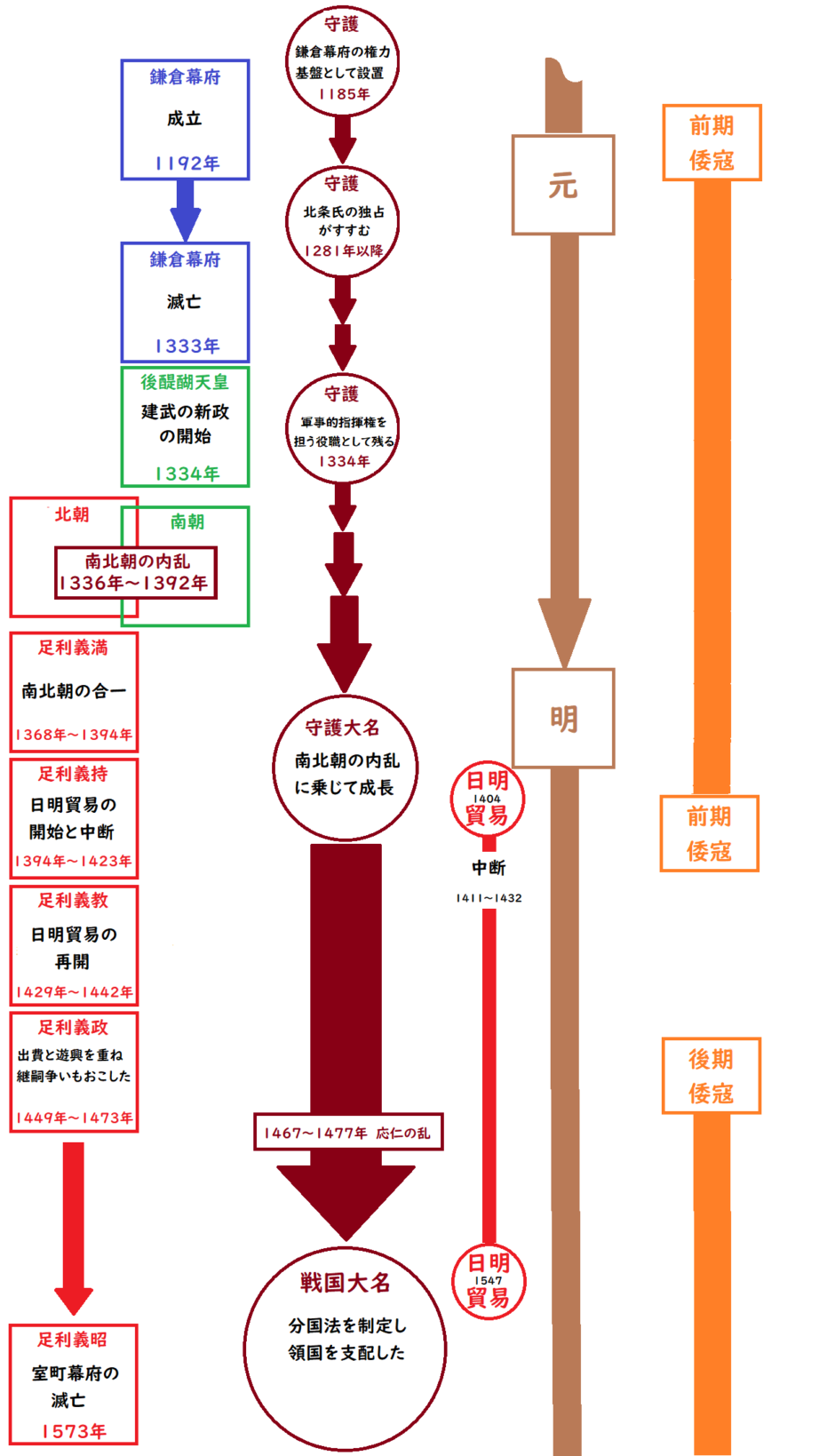 日明貿易とは室町。明は海禁政策と冊法体制の時代。倭寇(2017年度上智大学文学部にて出題)への警戒は現代で言う外患誘致への警戒の意味合いもあった。遣明船は明交付の勘合の所持が義務付けられていた。このことから勘合貿易(2018年度法政大学文学部にて出題)とも呼ばれる。幕府独占で幕府船が毎年派遣された(1401年~1410年)時期があり、それを過ぎると守護や寺社が参加し10年~15年に一回の間隔になった(1433年~1495年)。応仁の乱(2018年度広島大学文学部にて出題)以降は大内氏と細川氏の船が派遣されたがこれは室町幕府の衰退と関連しているという見方がある。平安から鎌倉にかけて行われた日宋貿易との共通点に、宋銭、明銭の輸入で国内貨幣経済(納税、金融)が進展したことが挙げられる。