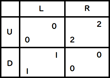 いまプレイヤー1が戦略( U , D )、プレイヤー2が戦略( L , R )を持つ同時手番ゲームにおいて上記の利得表(左がプレイヤー1の利得、右がプレイヤー2の利得)が与えられるものとする。このとき純戦略の範囲においてナッシュ均衡を求めよ。但し、導出過程も説明せよ。
