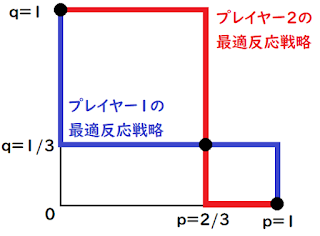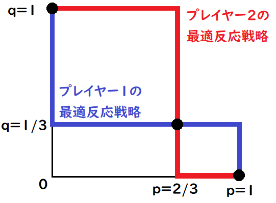 図示された各プレイヤーの最適反応戦略の集合、その交点がナッシュ均衡であるから、このゲームにおけるナッシュ均衡(p,q)は3つあり、それらは(1,0),(2/3,1/3),(0,1)であるから、純粋戦略の範囲内でナッシュ均衡は(1,0),(0,1)である。