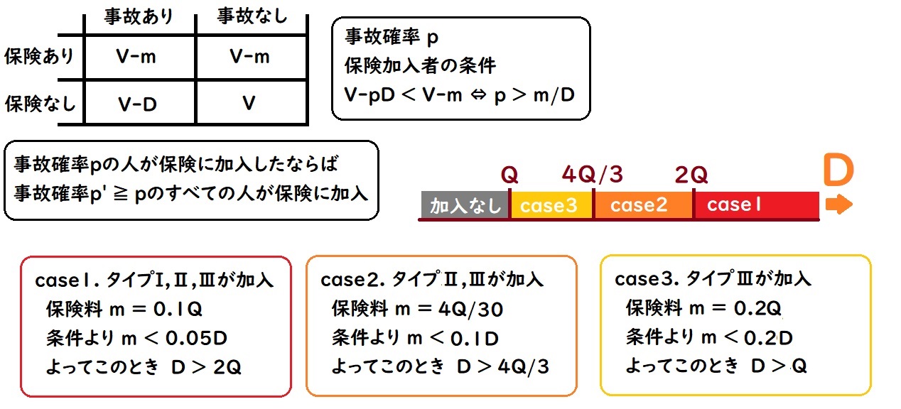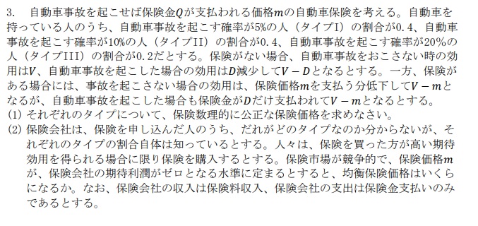 2018年度京都大学経済学部の過去問、ミクロ大問3はゲーム論の出題でした。これはベイジアンゲームと思われます。交通事故による負の効用(損害)が大きくなるほど加入者が増えることを、Dの場合わけで再現しながらそれぞれの均衡価格を求めますが、上のように境界条件に気づけば考えるべきケースが3つであるとわかります。この問題を解けた人は有利だったと思います、ゲーム論の問題として2年生の経験値では難しい部類ではないでしょうか、私も悩みました、今後とも精進いたします。