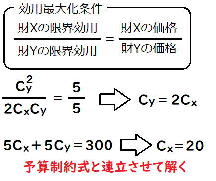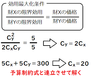 X財とY財が存在し、どちらの価格も5であるとする。財の消費量をそれぞれCx,Cyとすると、ある消費者の効用(U)がU=Cx*Cy*Cyで表現されるものとする。所得が300であるときの、この消費者のそれぞれの財の消費量を求めなさい。(一部改訂)
